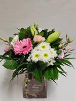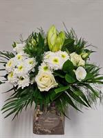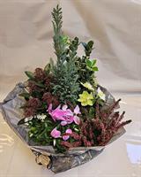Photo non contractuelle | COMPOSTION FLORALE URANUS Composition de plantes vertes et fleuries, l'assemblage varie en fonction des saisons et de la disponibilité en magasin.