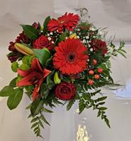 Photo non contractuelle | BOUQUET MARS Bouquet circulaire aux tonalités rouges et vertes. Les types de fleurs peuvent varier en fonction des saisons et de la disponibilité en magasin, tout en préservant l'essence, la forme et les couleurs du bouquet.