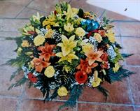 Photo non contractuelle | GERBE ALIZEE DESSUS DE CERCUEIL Assemblage de fleurs naturelles coupées variées selon la saison et la disponibilité en magasin. (différents choix de couleurs)