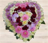 Photo non contractuelle | GERBE VENUS Assemblage de fleurs piquées en forme de cœur, les types de fleurs peuvent varier en fonction de la saison et de la disponibilité en magasin, tout en préservant l'essence, la forme et la couleur de la gerbe.